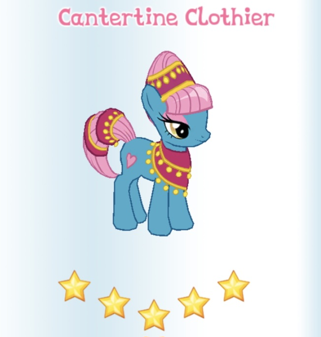 Cantertine Clothier is an Earth pony mare added in Update 8.3. She is a helper in siege stage 6 of the Adventures in Rockology event.