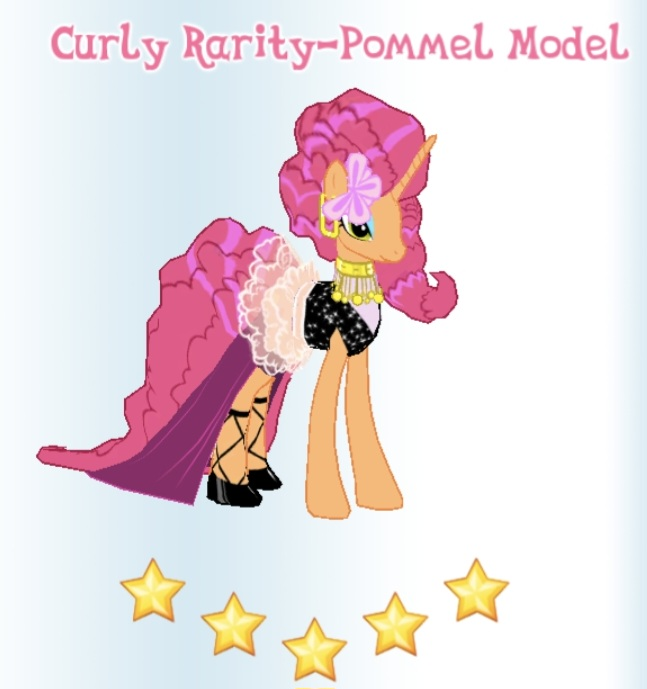 Curly Rarity-Pommel Modelis an unicorn mare who lives in Ritzy Domicile in Ponyville. She was added in Update 9.0.
