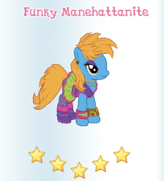 Funky Manehattanite is an earth pony who lives in Ponyville.She was added in Update 9.0.