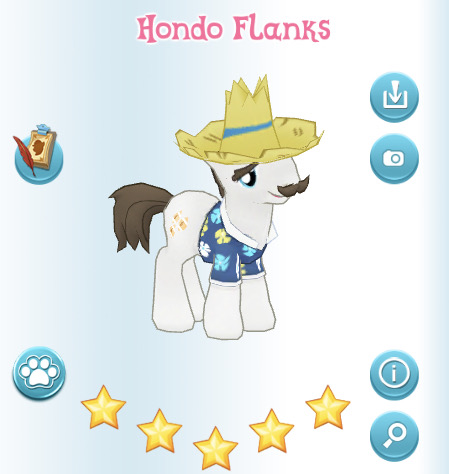 Hondo Flanks was one of the characters available in the beta version of My Little Pony presented at My Little Pony Project 2012 New York, at a cost of 70000
