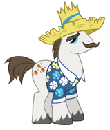 . He has thick, brown eyebrows and facial hair with a brown mane and tail. His coat color is grey, and his hooves are a cool grey. His eyes are blue and he wears a straw hat and a blue tropical shirt.