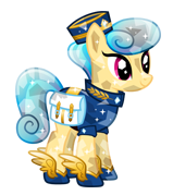 She is a messenger pony with swirly cyan hair, yellow skin, purple eyes, a black and yellow round hat, a black suit, black shoes with golden wings, and a white bag with a yellow strap