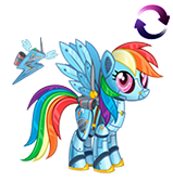 Robo Rainbow Dash is one of several characters in the game with an ability/mechanism (the first ones being the Dark Changeling Mane 6) that allows the player to transform them into their alternate appearance(s), if the player has also purchased their alternate appearances from the Collection or Shop. In this case, Robo Rainbow Dash can be transformed into Supercharged Rainbow Dash.