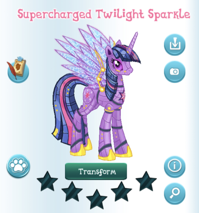 Robo Twilight Sparkle is one of several characters in the game with an ability/mechanism that allows the player to transform them into their alternate appearance(s), if the player has also purchased their alternate appearances from the Collection or Shop. In this case, Robo Twilight Sparkle can be transformed into Supercharged Twilight Sparkle.