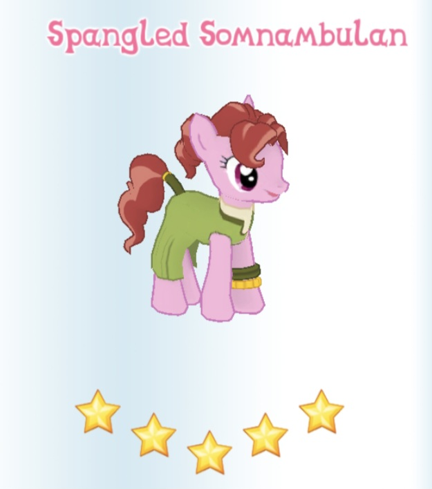 Spangled Somnambulan is an Earth pony mare added in Update 5.2. She lives in The Somnambul-Inn, located Ponyville.