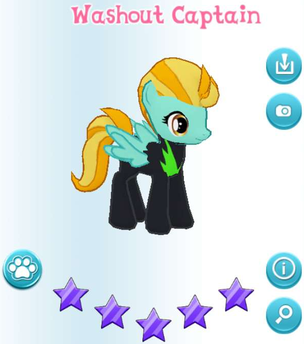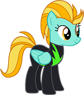 Washout Captain is a washout variant of Lightning Dust, who lives in the Shadowbolts' Hut in Ponyville. She is the stage 4 reward from Wonderbolt for a Day.